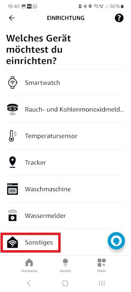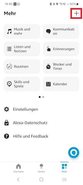 Auf dem Smartphone die Alexa App öffnen und den "+" Button auswählen: