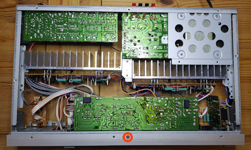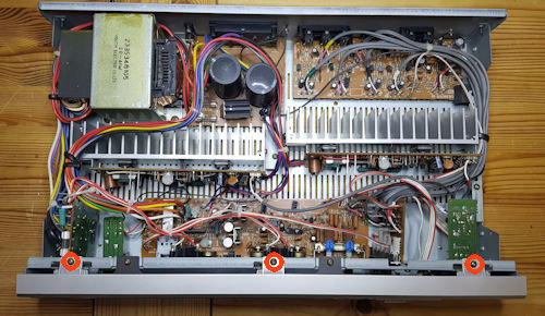 Nachdem das Gehäuseoberteil abgenommen wurde können gleich die drei Schrauben der Frontblende (rot eingekreist) entfernt werden.