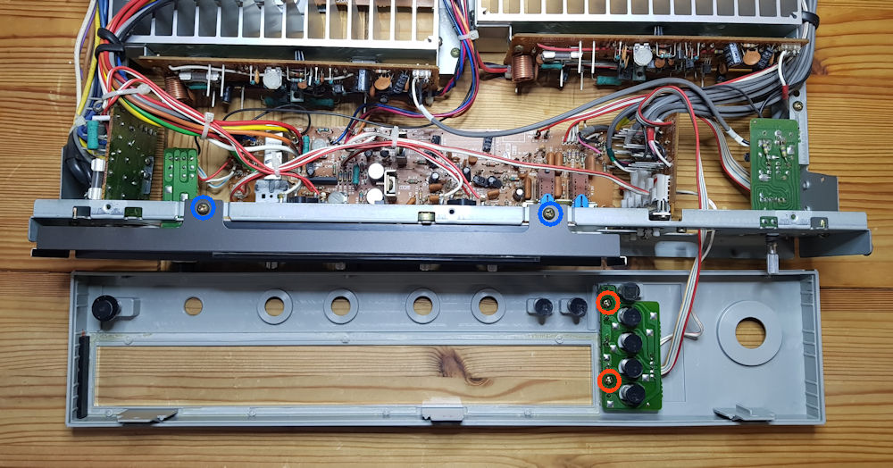 Nun können die beiden Schrauben des Skalen-Rahmens (blau markiert) entfernt werden. Der Rahmen selbst kann noch nicht abgenommen werden, da er mit doppelseitigem Klebeband an den Skalen befestigt ist.
