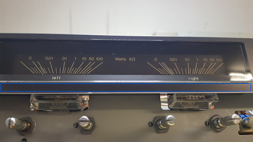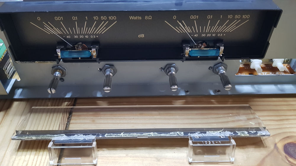 Das Skalen-Glas und den Rahmen habe ich vorher gereinigt und die alten Kleberreste entfernt. Das Skalen-Glas wurde wieder mit einem Klebestreifen fixiert und der Rahmen wieder mit doppelseitigem Klebeband fixiert. Hier habe ich jedoch nur zwei kleine Stücke im Bereich der Spulen angebracht und den Rahmen nicht über die gesamte Breite verklebt.