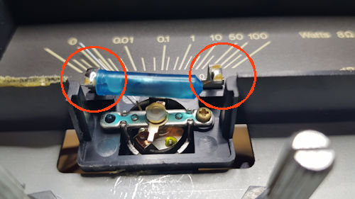 Das Skalen-Glas ist im Rahmen nur eingesteckt. Unterhalb den Spulen ist es jedoch mit zwei Stücken Klebestreifen befestigt (blau markiert). Dies müssen entfernt werden, dann kann das Glas vorsichtig abgenommen werden.